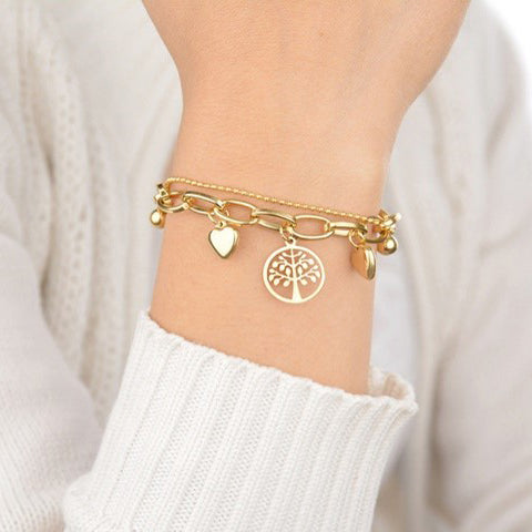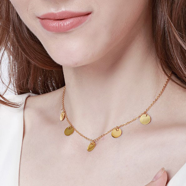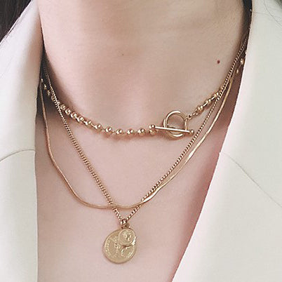 Die längenverstellbare Halskette aus unterschiedlichen Ketten ist der perfekte Look zu jedem Anlass. Eine nah am Hals liegende Ankerkettemit goldigen Bällchen, einer schlicht gehaltener Zwischenkette und einer längeren Kette mit einer schönen Goldmünze.